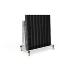 Wagen mit quadratischem Rahmen, dessen Kontaktflächen als Kratz- und Stoßschutz mit Kunststoffmaterial überzogen sind, und mit Gummi überzogene Auflagefläche, 4 Lenkrollen, davon 2 mit Feststeller. Je nach Modell 8 oder 16 Fächer für Randbeschläge, davon 3 oder 6 in modularer Ausführung, 7 oder 14 Abteile für Winkelstücke, 1 Ablage aus Metall. Tragvermögen 730 oder 660 Kg.